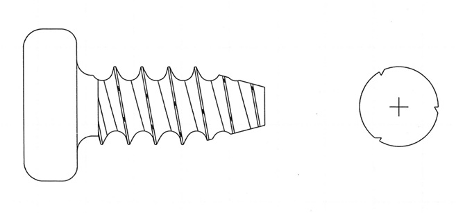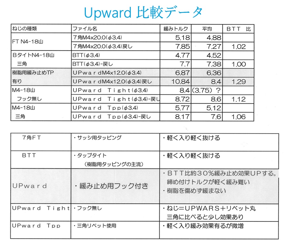 UPward®は株式会社ティーディーエルが開発した樹脂用タッピングネジで、ねじ山の頂辺を上方にやや傾斜させ、かつネジ山に等間隔のV字状切込きを形成することにより緩み止めの機能を持たせたねじです。